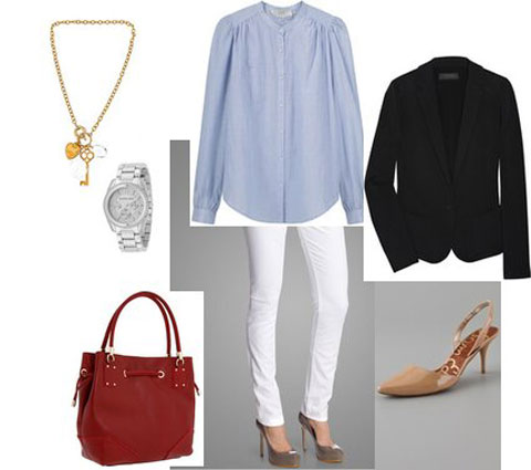 Nếu bạn đang trên đường đến văn phòng tại sao không thử mặc một chiếc quần jeans denim màu trắng với chiếc áo sơ mi đơn giản màu đen hoặc màu trung tính.