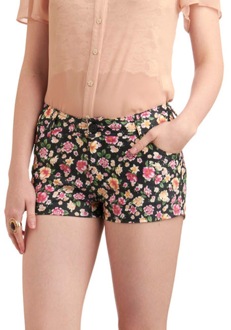 Short denim in họa tiết hoa rất phù hợp trong những tháng mùa hè. Tông màu được ưa chuộng nhất là màu nền đen với họa tiết hoa màu cam và hồng. Bạn nên chọn một chiếc áo có màu hồng hoặc cam để mặc kết hợp với kiểu short denim này. Một chú ý nữa bạn chỉ nên chọn những đôi giày cao gót có màu trung tính để tạo điểm nhấn cho chiếc quần short của mình.