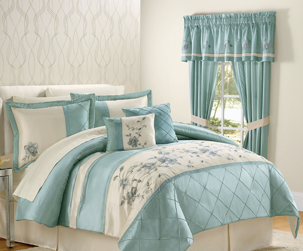 | Bộ chăn ga gối đệm có tông màu hợp với màu rèm cửa. |