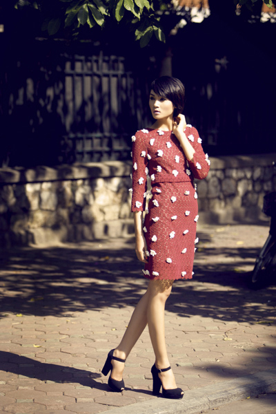 | Với thân hình mảnh mai, Thùy Trang đã tránh diện những kiểu váy ôm sát cơ thể. Cô chọn một chiếc váy có kiểu dáng hơi suông, dài tay, màu sáng. Chiếc váy này sẽ che đi được phần nào thân hình gầy gò, vòng một - vòng ba không nở nang cho bạn gái. |