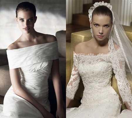 Ngoài những kiểu cổ thuyền với độ rộng - sâu vừa phải mang lại vẻ kín đáo cho người mặc, kiểu cổ thuyền trễ nãi như muốn “tuột” khỏi bờ vai rất khêu gợi, giúp cô dâu khoe trọn bờ vai thon thả và vòng một quyến rũ. Vẻ gợi cảm, ngọt ngào là điều mà chiếc váy cưới cổ thuyền trễ nãi mang lại.