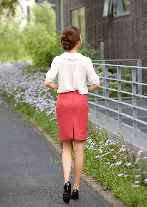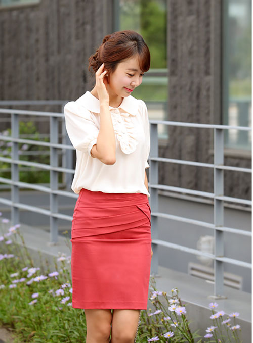 Thứ Hai: Thanh lịch với sơ mi trắng + chân váy đỏ