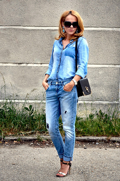 Một "cây" bò đang là set đồ được ưa chuộng nhất mùa hè này. Bạn có thể chọn những chiếc sơmi jean bó sát hoặc có độ rộng thùng thình đều phù hợp với jean boyfriend.