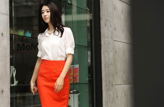 Bạn hoàn toàn có thể trở nên thật trẻ trung, phóng khoáng với sơ mi trắng bằng cách kết hợp với chân váy có màu sắc nổi bật |