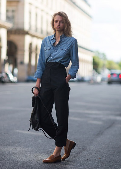 Áo sơ mi denim sơ vin cùng quần cạp cao mang đến cho bạn ấn tượng mới mẻ, hấp dẫn.