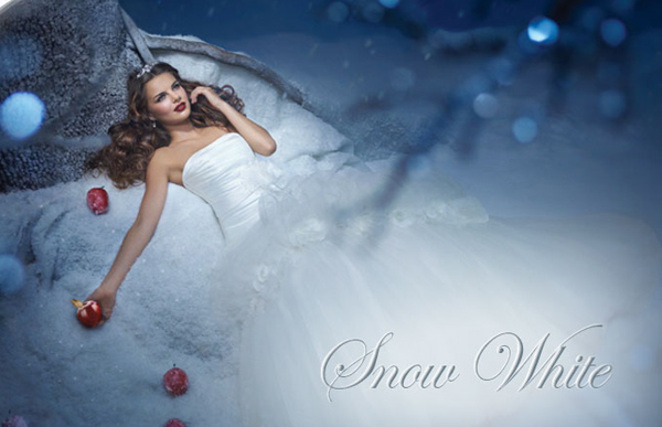 Dựa trên tạo hình và tính cách của các nhân vật như Bạch Tuyết, Lọ Lem... những chiếc váy cưới bồng bềnh khiến cô dâu như bước ra từ cổ tích.